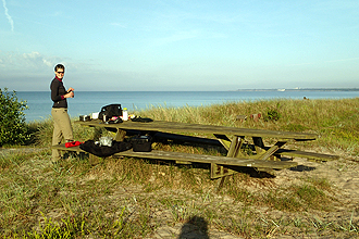 Our flight was on time and we both got a bit of rest on the plane. We arrived in Dubai an hour ahead of schedule and made use of the free shower facilities (so nice to freshen up). Our flight to Copenhagen departed at 8.30am, and was also a pleasant flight. We put the bikes together and packed; there was no rush as the train to Malmo and Lund was to leave at 4.42 pm so we ended up waiting around a bit. No other trains were running due to an ongoing strike affecting all trains through the tunnel. We bought the tickets but were in for a rude shock when as Mike loaded his bike onto the train the conductor blew her whistle and came running down the platform - "No bicycles on the S-train". What to do? All the DSB trains that took bikes weren't running due to the strike! They were running replacement buses and amazingly we could put the bikes INSIDE the bus even while they were fully loaded and all (which the other passengers weren't too happy about. When we got through the tunnel and over the bridge to Malmo though we were told that we had to get out there, and then catch the train to Lund. When the train arrived there were so many people waiting to get on that there was no space left for many passengers and obviously us with our bikes. We got on the next train and then found that it did not go to Lund, and ended up in Malmo. We decided to cut our losses and cycle the 10km to a campsite south of Malmo (First Camp Sibbarp). We had wanted to stay in Lund as it has a really old cathedral and is an interesting place but it was already 6pm and so much time had been wasted. We arrived at Sibbarp at about 7pm and had yoghurt for supper (had not had time to shop as yet). The ride along the coast road was a lovely one.