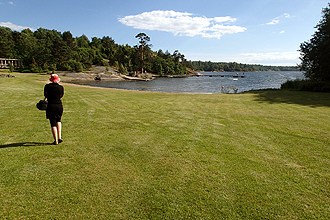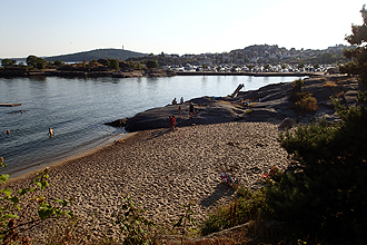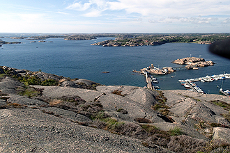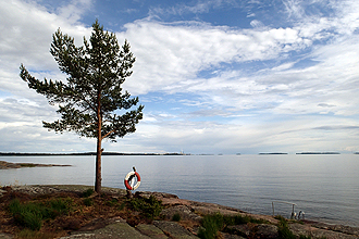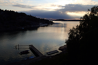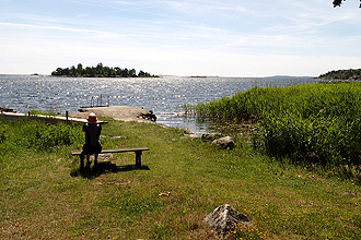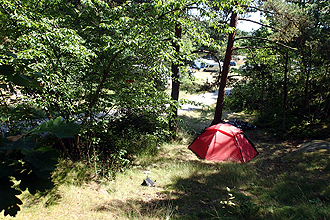 With about 12 km to go to our intended bush camp we saw a sign for "Jarnaviks Camping 5 km" and thought we would check it out. We were keen to bush camp also for the seclusion and to use our new Steripen water purifier, but the prospect of a warm shower to wash off our salt encrusted skin was also tempting. The campsite was in the small settlement on the coast; a tiny sheltered bay with swimming beach. The water was crystal clear and you could walk out on jetties over the water. We took a walk around the bay to where massive boulder outcrops met the water and sat for a while in the sun looking out over the bay. The view was of the typical Swedish coast; small islands dotted the bay as far as the eye could see and fir and oak forests met the shore. It was lovely. The campsite itself was beautifully kept and cared for and the price to camp much lower than we had expected.
