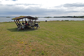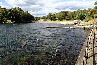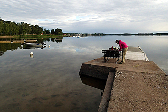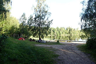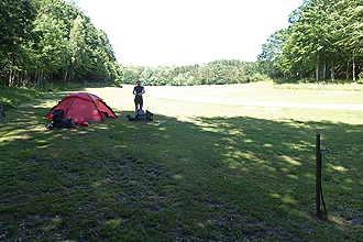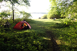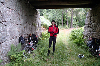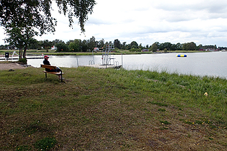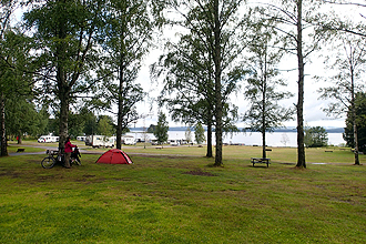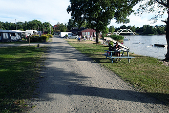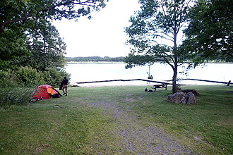 We encountered only one shop throughout the day and sat at a nearby church to eat around 10:00 am. The temperatures had been cool all day, mostly due to a slight headwind which really reduced the temperature. In the early afternoon we stopped at yet another church to eat some grapes and could see these massive dark clouds and rain in the distance. By the time we realised the storm was heading our way we were in no-man's land, but pulled off the road into a field and as speedily as we could donned rain jackets, pants, booties and rain gloves, all the while the storm broke over us cumulating in hail stones. By the time we were back on the bikes it was starting to let up but had become very cold. After a while we took off the rain pants and jackets until the next storm hit. We had some dirt road riding and were heading for a bush camp. We came across the Kinda Kanal about 10 km short of our intended campsite and the area is popular with hikers. There are a number of long trails in Sweden and there were some maps of the area showing bathing spots on lakes and hiker's shelters. The spot at the Kanal had spotless and new ablutions with shower, toilet and kitchen and the man who operated the Kanal said we could camp over the road. Nice offer, but we decided to aim for one of the bathing spots on the map about 2 km away instead. It was a brilliant camp spot with proper bathing beach complete with jetty, board walk and rolling green lawns and benches. Also, toilets and changing rooms. We would enjoy the sleep!