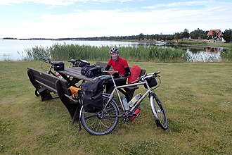Another beautiful day and a great riding day. We woke around 5.30pm having been in bed at 8pm the previous night but as the campsite office only opened for checkout at 8am we spent some time in the kitchen area, having breakfast etc. We hit the road at 8am and the day was very enjoyable; absolutely flat with many sea views and gorgeous sunshine. What a change from the previous time we had visited Sweden where they had the coldest start to summer in 80 years or something. It was quite breezy and although we had a cross wind mostly it was more of a help then a hindrance; unfortunately not the forecast westerly which would have provided a tail wind all day (or most of it), but still very pleasant. We passed many small towns and villages; almost always the navy blue signs of the Cykelsparet directing our route. Amazing that there were dedicated cycle ways running parallel to main roads even through the areas were so sparsely populated and we didn't see many other people. As usual the quality of Swedish roads/cycleways was superb.