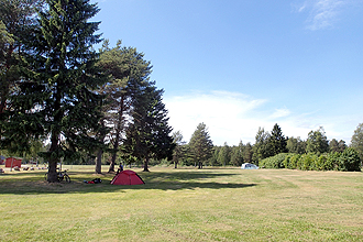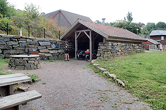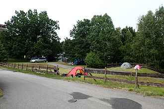 We rested again with two climbs to go in the shade of some birch trees and then again before the last climb. Of course the good thing with these climbs is the dazzling downhill descents which we had a few of. The last 7 km was along the river leading to the campsite and of course there was even more climbing on this road. We had had hot weather all day and had even used sunscreen! We had drunk a lot of water and apple juice and eaten grapes and nectarines as we were so thirsty. Along this final stretch though, we could see heavy rain clouds quite close by and then thunder and lightning. Within the last 900 METRES the heavens opened and so, after riding 107 km in the baking sun we arrived at the campsite drenched.