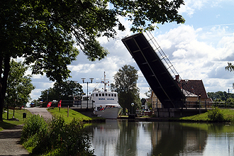 Wow, seemed like a long day. No rain today which was fabulous and by mid-afternoon we had taken off our warm gear and were back to shorts and t-shirt. There was a bit of climbing today but not the nasty steep ups and downs of yesterday. We stopped early in Linkoping for some supplies. We were surprised by the town; it was large and had a lovely position along a river which also formed part of the cycle route taking us through the town. The cycle route continued for some distance which was great and we were off the main road for much of the day. We had planned to have our brunch spot as usual after about 40 km and this took us to the town of Berg and its large church. There was not a place easily spotted around there for a snack break (we prefer a bench please!). We pressed on for another kilometre and came across the surprise of the day: a 20km cycle path along the Gota Canal from Berg to Bordery (?????). The river was dotted with craft including the large tourist boats as people take cruisers up and down the canal to experience the locks, etc. Very interesting to watch with bridges that open skywards to allow the boats into the next section. It reminded us of some of the Rhine Route but on a smaller scale. We enjoyed our meal and also the route.