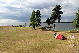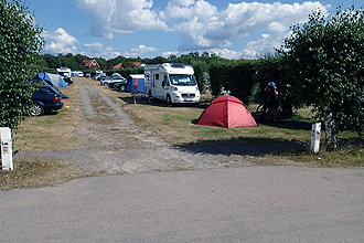 Our campsite for the night was on the water at a small harbour. It was clearly a very popular place (bearing in mind we were now on the east coast and not far south of Stockholm) and packed with caravans. The cost was very high and we were directed to the tent area which turned out to be a swamp. Fortunately there was another tent area. Amazing to be in amongst the locals and just observe people; plenty of screaming blond kids about and also DOGS everywhere. They seem to accompany their owners all over.