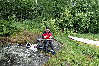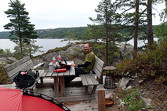 We had planned to stay at a bush camp that from maps, Mike had guessed would be good and which also seemed popular with kayakers, but ended up getting one just short of it in what seemed to be a kayaking camp with interesting activities set up like climbing walls, etc. It was not signposted but had toilets and really nice boardwalks for making getting into the water easy. We decided to set up camp; this was one of the most beautiful camps of the trip with views of the lake and islands and plenty of benches.