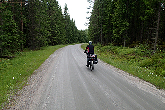 The route today moved away from any sign-posted cycleways and that added to the remoteness. There was not a thing to see along the way other than beautiful Swedish forest which was the reason we were here so that was not a hardship. We stopped 3 km from our campsite to shop at Coop and that was a good thing as we did not see a shop for the next 75 km. The route was largely on gravel road, with ups and downs as these sorts of roads always have, and it rained for about 80% of the day, sometimes heavily. So we were in full wet weather gear and only managed to stop and eat after 50 km as there was a break in the rain, and we found a spot on some rocks next to a lake to sit. It was a bit late in the day but stopping in the pouring rain just leaves you cold. We really appreciated our flasks which we filled with coffee in the morning and was kept piping hot 'til we needed it. OF COURSE 500 m down the road from where we sat, we came across a fishing hole complete with mowed lawn and wooden bench. This was the only bench to be seen in all 90 km riding! It is remote out here.