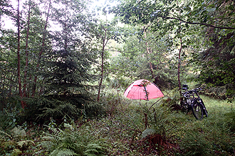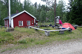 Our bushcamp was actually at a tearoom and had a lovely swimming hole. There was a large camping area and toilet and they charged a nominal fee. Again we braved the cold water (16 degrees today) for our "bath" and enjoyed our meal before getting into bed and out of the elements! We had been following the Runte Vatter cycle route as well as the Sverigeleden Route and our ride today had taken 7 hours 16 min but we were "out there" for 10 hours in total. One longs to be "indoors"; for us this is our tent! So we enjoyed an early night and looked forward to a shorter day the next day. We had ridden about 350 km in three days.