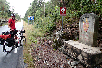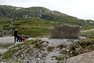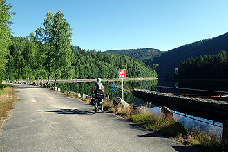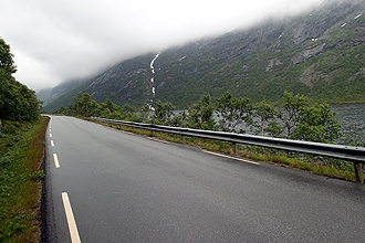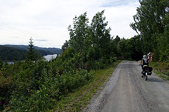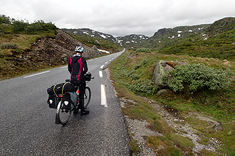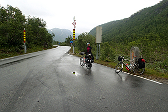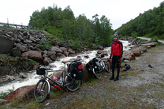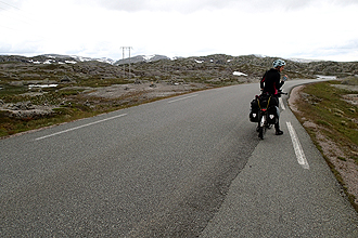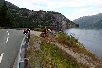 We had no rain all day but it remained overcast and very cold. We piled on the gear and found the ride enjoyable for the most part. We had a busy section of road after entering Norway for about 15 km or so; the road itself was beautiful but there was a lot of tourist traffic: camper vans and cars towing caravans and it was unpleasant. Norway seemed as remote as Sweden as we didn't see any shops so were pleased we had stocked up before leaving Sweden.