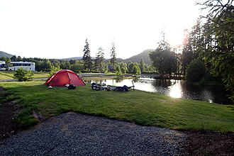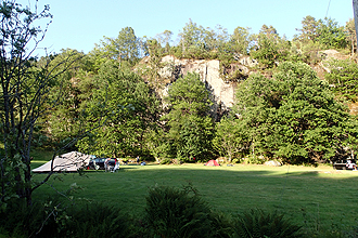 The campsite was quite touristy but very nicely situated on the river and we could pick a site or camp on the field. We opted for the field as it was raining when we arrived and there was a wooden covered "stage" that we could put the tent up on. (advantage of our Hilleberg Staika tent which does not require pegs). We arrived early at 3 pm so had ample opportunity to relax and watch the changing moods of the river and the rain.