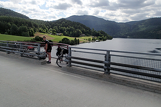 The main climb had many switchbacks and was quite long but doable. We dropped down to a town afterwards where some weather started coming in and put on rain booties and jackets. Shortly after this our route went left to ride on the other side of the lake but we chose to stay right on the "red road" which was a good choice. The road was similar to the one we were on in the morning; narrow with spectacular lake views but flatter and for the first time in three days we were able to get some speed up. Where we rejoined our planned route we had another decision to make when the cycle route turned down right and looking at the profile on GPS it looked like we would drop down and then have an enormous climb. We were unsure what to do: stay on the main road or turn down this route and risk a climb. Looking at the map on the info sign though we decided that the GPS was wrong: such a climb could not exist as the route went down to the lake and along to Dalen. We were so pleased that we had trusted our instincts as the road was amazing and it would have been a shame to have missed it. It twisted downward like a snake with short sharp bends and you could take in the views as you went. The scenery could only be described as "moody": dark misty cliffs descending into slate grey clear waters. It was an amazing ride.