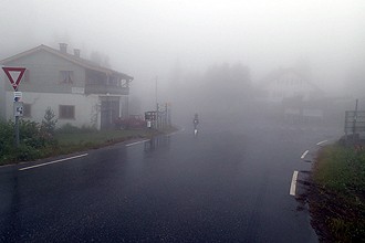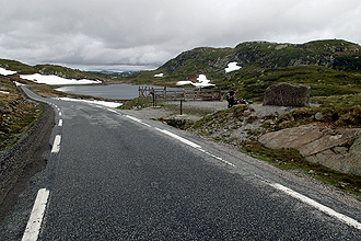 After the switchbacks the climb continued until about 11 km where we stopped for something to eat at a sculpture garden and traditional house collection. We had been going for about one and a half hours at this point. The climbing continued but was levelling out now. We climbed for about 30 km. The road climbed above the tree line and there were dramatic changes in vegetation and landscape. The mist had cleared by now and we passed lakes and a ski lodge. We kept climbing, with some dips in between. The road narrowed but traffic was light all day. It rained intermittently. Now we could see snow patches from high on the mountains to quite low down in the crevices.