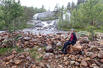 We passed waterfalls which were explosions of water gushing over huge boulders. The downhill sections were steep in between little climbs and we flew passed one of these, noticed it and turned back to stop and look. There was a German couple there in a camper van that we chatted to; they were going to Dalen and had come from where we were to overnight. We were passing only through open countryside; no settlements or villages existed up here.