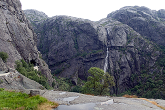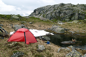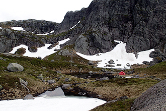 We had aimed to camp at a bush campsite about 8 km short of Lyseboten on the top of the mountain as we wanted to catch the ferry from there along the fiord. We would still be able to wake up early enough to catch the 7:30 am ferry as it was all downhill from there. We picked a campsite very near to our initial bush camp site. We just realised that this was such a spectacular place and to go to Lyseboten just to fight it out with the campervans that had been passing us all day had no appeal. We picked a lovely spot right on a pristine pool for swimming in which boasted its own sheet of ice. The swim was brisk! What a privilege to spend the night here. The spot was right at the warning sign on the road for 10% descent for 8 km "vehicles engage lowest gear" to Lysebotn. We were tired of the cars in such close proximity all day and as we had a long downhill part of which was in a long 1.1 km tunnel we thought it better tackled first thing in the morning.