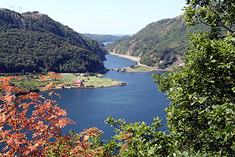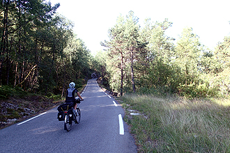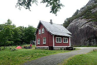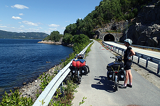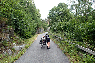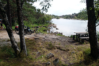We were due to camp just before Egersund and passed many campsites along the way. About 20 km from the end however we branched off onto a little road that crossed a bridge and the info board showed that it travelled through an area of natural beauty. It was a beautiful area with a very different character from the rest of the sublime coastal scenery we had encountered on the day. Once again, barren rock and huge boulders such as we had seen in fiordland. The hills were so steep as to be unrideable and our easy day's riding suddenly became a nightmare of pushing heavily laden bikes uphill. How could we have ridden all those hills last week and be defeated by this strange little road?