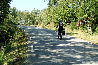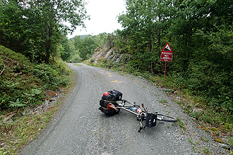 At Lyngdal we filled up with water as we were planning a bush camp. We then took on the steepest hill of the trip (little did we know) with gradients of 11% and 12% and even at a stage, 13% and 14%. I had a fit as I actually had to get off my bike and push about 200 m. The shame of it! We were both despondent and seriously annoyed then at this stupid route that was so steep it was barely rideable. Yet again the North Sea Cycle Route had crazy ideas of what a cycle tour is. A loaded bike is a different animal.