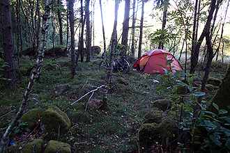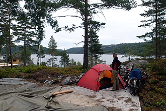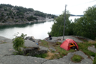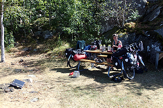 It was raining when we disembarked and we made our way to an ICA supermarket to shop for some food. We then went to the Stromstad campsite we had picked and could not believe the cost written up on the board, so I waited to ask the receptionist. 340KR a night truly beat all. We had never paid this much and weren't about to start now! We hopped back on the bikes and found a great little bush camp around the corner. No access to drinking water, but it was private and nice, so pitched the tent for the night.