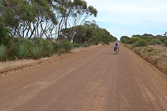 We woke the next day to an AWESOME tailwind. We reached the turnoff from the Playford Highway to Scott's Cove - looked down the stretch of corrugated gravel- looked at each other, felt the tailwind and said- "Let's go for it! 100-odd km's to Harvey's Return (Cape Borda) takes us to the western end of the island in one go!" There would be a 30km stretch of unsealed road to Harvey's Return into the national park at the end of the day.