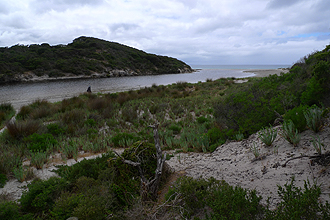 We set off to KI Caravan Park and were somewhat dreading the gravel road section again (now uphill), but actually it was not too bad - we set off accompanied by a group of bounding kangaroos that moved along with us - it was quite exciting - always worth getting an early start! After the gravel road we took the West End Highway turnoff towards Remarkable Rocks and then the South Coast Road. The day's ride was only 53km and a fabulous gradient - gently downhill so you could push your biggest gear with ease. We had been hoping to spend more time camping at bush camps in the Ravine Des Casoars Wilderness area/ Flinders Chase National Park but the area was still recovering after bush fires, so we were unable to enter. The caravan park was good though - we saw our first koala's in the wild. We had two days off here as the first day it was rainy and unpleasant and we wanted to go to see Remarkable Rocks and the Admiral's Arch - which was a 25km cycle away so you didn't want to rush out there in bad weather just to turn around and come back. So we spent the day lazing around and set off the next day in a howling wind to have a look. There is also a lovely light house at Cape de Couedic - right at Admiral's Arch. Also a fabulous seal colony there and as we were the first visitors of the day we completely upset them and they flopped and grunted away. The ride to Remarkable Rocks was quite undulating but enjoyable. Definitely worth the trouble. The views of the coastline were also beautiful. We set off the next day for Vivonne Bay - another short ride away.