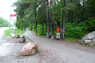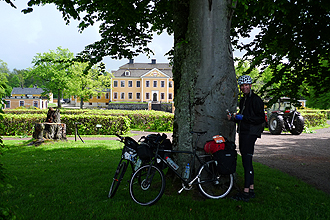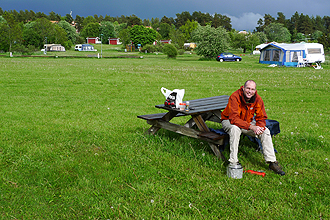 We had planned to camp at a town called Norrtälje and arrived at the campsite which was not attended. There was a telephone number to call and I was told that the site was not yet open for the season but we could camp there for free. There was no water but we could swim in the lake down the road. There were two porta-loos which was good and we later found out from one of the caravaners that there was also some water in water containers for the couple of caravaners there. The campsite was otherwise beautiful - freshly mown thick grass and very quiet and open. The freezing rain set in again so we decided to leave out the swim in the lake, and instead used our wet towels to wipe ourselves down. i.e. our towels that had spent the day strapped to the outside of our panniers that were wet from the rain acted as cleaning devices! We had a good soup supper and then to bed.
