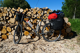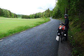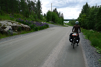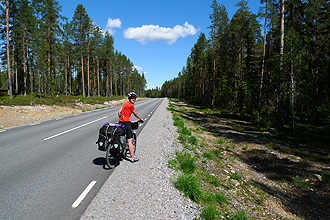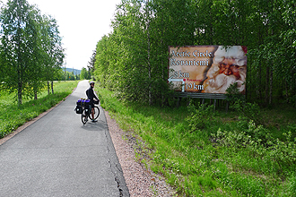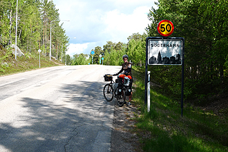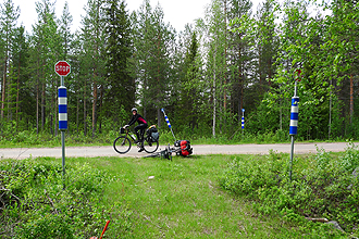 Prior to leaving home, Mike had calculated that his Rohloff would celebrate its 50,000 km "Birthday" in Sweden, and that this would occur at kilometre 888 into the trip (how convenient). Today was the Big Day! It was with excitement that we counted down the 19 kilometres to the Milestone at which time a lot of trumpeting and hollering took place. Luckily we were in the middle of nowhere! We stopped on the side of the road and leant the bike up against some logs for the celebratory photograph, and presented "Sir Speedhub" with some flowers. It's taken 52 months to chalk up the Milestone.