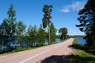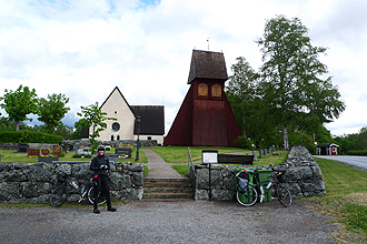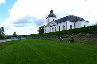 The day dawned misty and a bit rainy but soon brightened and was warm with a chilly breeze. We passed through farmlands, but any thought of stopping was soon changed by the hordes of mosquitoes that zero'd in on one when you stopped for longer than 2 minutes. The roads were once again quiet and smooth, with some gravel road at the start. We took a slight short cut from our originally intended route avoiding Lövånger. We had noticed changes in some of the architecture, particularly with the churches that had gone from huge imposing structures high up on hilltops to smaller buildings with very high, dainty, bulbous turreted steeples.