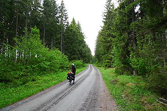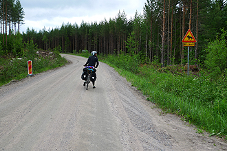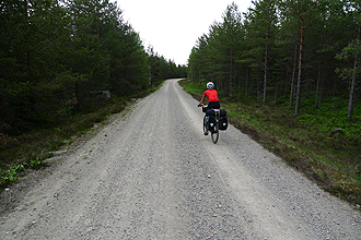 After that our new cycle route - follow the brown sign with diagram of bicycle on the front - branched off to the right. The road was dirt but good condition until about the 42 km mark when it became very sandy and then a single forest track. Due to a lot of rain in the area the sand had washed out a lot particularly on hilly sections. There was quite a bit of climbing. The forest track or jeep track section was very potholed but so beautiful. The forest seemed in touching distance on both sides. Overall the forest areas seemed to have very lush undergrowth and were very thickly grown. On one steep downhill section we came across a herd of female reindeer and young ones. We stopped at first and they stared at us and then carried on feeding by the roadside. Then we had to get going and they got spooked and ran for ages along the road ahead of us; gangly legs and large feet pounding along before dashing into the forest.