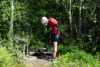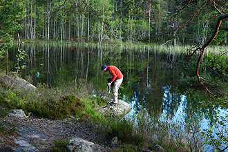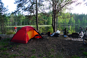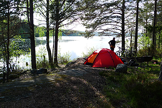 This was the coldest day I recall on a bicycle. We did not have rain but we had already learnt that if you are travelling either just in front of or just behind the rain the temperature drops by what feels like 10 degrees. We stopped for a few geocaches and arrived at a large town Gavle after about 30kms. We aimed for McDonalds and their free Wi-Fi to check and send e-mails, etc. We had a couple of burgers and coffees and then got back on the bikes. I put my balaclava hood on under my helmet and didn't take it off at all for the rest of the day. Each time I got off my bike and then got on again my behind froze off. I kept thinking it might snow! The riding was very good and the roads quite flat. We stopped at a few very picturesque places for geocaching. We were aiming for Ljusne and the local campsite but instead stopped at a beautiful bush camp Mike had found on Google Earth. We had to ride a couple of kilometres on a dirt road and then push along a small walking track for a few hundred metres and then we had the most spectacular camp setting; flat spot for the tent, lovely spot to swim and perfect view. We did bring the water filter because although the lakes seem pristine you never know what could be lurking, and a stomach problem can make you very sick. So we always filtered when drawing water from the lakes and then added purification tablets to the water we would drink. There were lots of bugs but we had mozzie repellent. We also spotted our first wild fox which was a treat. It was a wonderful calm evening and the rain was behind us.