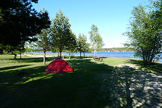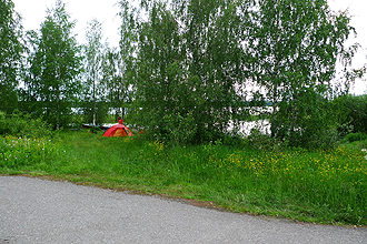 We arrived at 10:30 am as we had stopped for a few geocaches and were told that as it was Midsomer's Day the shops in town were all closing at 12 pm. We managed to get there in time for food, etc. after pitching the tent and showering (bliss); it was only a short walk. There seemed like a lot to do in the town but everything closed early for the holiday weekend and supermarkets would not be open the next day either. We decided to have a rest day here to see more of the sights and as it worked out this was forced on us anyway as we could only catch the train with the bikes on Sunday at 4 pm. We knew that we would have to catch the train some distance as we did not have enough time to make it all the way by bike to Helsinki. There were no trains on Friday or Saturday due to the Midsomer Weekend with buses replacing them. The train trip on Sunday was 4 hours long to leave at 4 pm arriving at Ylivieska at 8:30 pm so that meant we could make the most of our campsite checkout of 3 pm! We had a beautiful campsite right on the river.