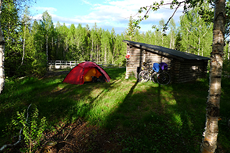 On Sunday we slept in, went again to town to shop for food (shops open at 12 pm on Sundays) and then went back to the campsite to eat, shower and pack for the train. We got to the station at 3 pm and the train was due to leave at 16:11 pm. The trip went quickly and we arrived at Ylivieska station at 8:30 pm. We then had a short ride (10 km) to a camping area marked on our map. We passed a lady working in her garden on a farming area on the way. We arrived at the cutest little place; a bench and Hansel and Gretel type hut with fireplace for cooking. Many mozzies! Over the river was another similar hut and what looked like a toilet, with quite a lot of people there fishing. The lady then arrived on her bicycle and tried to explain something to us but couldn't speak English. She gave us a brochure for a holiday cottage that we assume was hers as she wanted to rent to us. It was just next to the place where we were. She did not seem happy about us camping there although she was very friendly. We showed her our map though and she seemed okay with that. We eventually got into bed at midnight. The fishermen were still fishing and the farmer still working his fields in broad daylight. The mozzies got the better of us tonight!