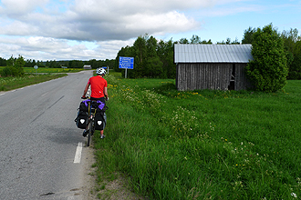 We woke up to rain in the middle of the night. As this was due to be a very short day at 60km (due mainly to the fact that we had done the extra km's yesterday) we were happy to have an unusually lazy start. However even with this in mind, a 10am start is exceptional for us! It takes ages to get dressed and pack up inside the tent when it's pouring with rain (as it was). We eventually got out of bed at 8am and went to the kitchen to make breakfast, meeting up with a very friendly Polish man there. The rain was quite hard at this time and didn't look like clearing.