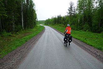 We were not sure what our distance would be today as we were not sure where we would camp. It is fun not always to have an absolute plan. We set off around 9 am from our wonderful bush camp. The route was quite undulating with some steep climbs and wonderful downhills. There was a 10 km dirt road section which was very fast and smooth and also mainly downhill. We stopped in Petäjävesi at about the 30 km mark for chocolate mousse and also bought some chocolates but nothing else as we thought we would shop again in Jämsä. We always carry at least one emergency meal - usually soup in case we don't see a shop. It would come in handy today. We had a slight tailwind which was good but as we had found in Sweden the north wind is freezing. We couldn't believe it but we were back into woollen tops, beanies/balaclava, booties and full gloves on the bike today. It didn't rain, but was very cold. We were quite pleased that we had not pushed on last night as it would have been a long ride. We passed the camp site we had planned to reach at around the 45 km mark.