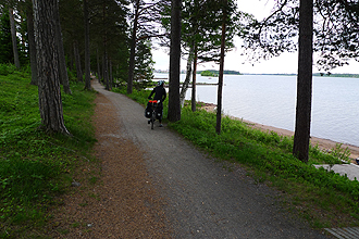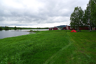 We set off from the Skellefteå campsite at 8:10 am, our aim to reach Piteå, the next large town about 96 km away. The route started out quite undulating with some steep little climbs early on, but soon settled to some wonderful straight, flat, roads that went on forever; a brilliant day's riding. The highlight was the town of Byske which we arrived at after about 30km. The bridge crosses the Byske River which was a raging torrent and many people were fishing along the banks. There is a huge wooden sculpture of a fish as well. Fishing is important work in this place. After this point the road climbs quite a lot and we passed through some drier pine plantations. Beautiful riding. We had a rest stop at Alund (road crosses same river but much calmer). There was a picnic spot here with a shelter overlooking the river just before the 60 km mark. Thereafter there was some climbing before a descent to Hemmingsmark. We also stopped about 10 km short of Hortlax and were tempted to camp at a lovely swimming hole on the river with its own picnic table and fireplace as well as a toilet. As this was around 82 km we decided to press on to Piteå instead. We were amazed at the campsite we arrived at, all chock-a-block and packed with people, dogs and kids. The first one we arrived at even had a jazz festival on the go. Not what we have in mind after 100km ride. And the price to camp at that one was the highest yet - 175 Kroner per night. We went to a second campsite which we just by chance ended up passing. Didn't even consider it due to all the people around, and the space available. We then made an effort to go to a campsite on a local island and on arrival were told that there were no sites available (even for our small tent!), even though you could see plenty of space. We thought just as well, as there was a dog which howled not stop from the time we arrived to the time we left. Definitely couldn't have put up with that! So we pushed on again and eventually ended up at a site near Norrfjärden (Ladrike Camping). This turned out to be perfect for us. Great friendly staff, and very quiet with basic facilities. We were on the bikes from 8:05 am 'til 5:05 pm. Quite a long day!