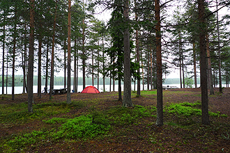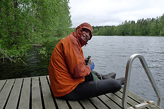 We had a few options for the length of the day. We could reach a bush camp after 78 km, or a swimming hole after 114 km or an official campsite after 140 km. The mosquitoes had been such a problem that we had more or less decided that if we could, we would go the long distance as the last 40 km seemed downhill and we were keen to try to get to Helsinki a day early. We stopped to shop in Saarijärvi and after that, the day turned colder. We stopped also at Uurainen for a geocache and about 5 km further on we passed a winner bush camp! With a little wooden jetty and a ladder into the water for swimming (bathing). It also had a toilet! Fabulous! We decided pretty quickly that 96 km was good enough and camped there for the night. Usually after about 5 minutes you are covered with mossies, sand flies or whatever the particular spot serves up but amazingly nothing materialised. No bugs at all. We thought it might have been because it was very cold and windy that they take cover. What a difference - We could just relax.