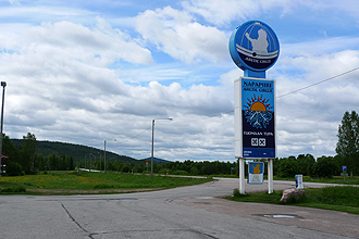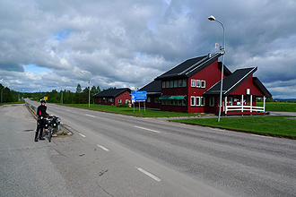 We had an 8.30 am start and crossed the border after 2 km's via the bridge over River Torne. We had quite a bit of rain overnight and it rained up until about 5:30 am. Luckily we had only had some drizzle on the bike. We first headed off to do a geocache on a bush track that really tested us as the mosquitoes had to be seen to be believed. There were clouds of them and they absolutely covered us all over. Luckily the cold meant winter woollies and with my balaclava hood, only my eyes and nose were out, but they still tried to bite us wherever they could. I had the lumps on my head that night to prove it; bitten right through my hood. Anyway, after that it was back on track and on a fairly busy road (route 21) heading north to cross the Arctic Circle. There were quite a few logging trucks but mainly coming towards us. After crossing the border the next excitement would be crossing the Arctic Circle which we reached after about 33 km. You are told about 10 km before and at the place is a big sign and good souvenir store. We stopped to make a purchase and look around (there are public loos here too). As the Arctic Circle fluctuates from tear to year, Mike checked where ir was exactly for 2012 so we could get the necessary photos!! The Circle is at 66 33'44"N for 2012 and that was actually a little past the shop so we stopped again.