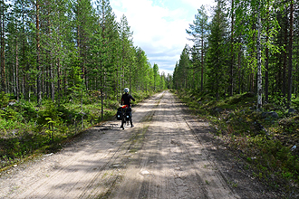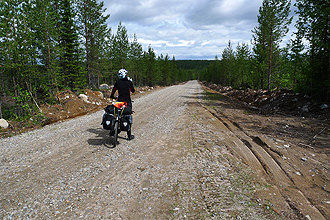 We really enjoyed the riding up to this point. Although it was quite rough in places, the area was so remote and very beautiful. After the track section we joined another road which was much wider but also a dirt road and it varied between sections of huge chunky stone chip/aggregate and sandy sections which were often thick and banked and difficult to negotiate. Not much fun! We then joined the surfaced road again and were aiming for a "holiday village" shown on the map but we weren't sure what this was exactly and by passed it to check out an on-road picnic site. On the way we came across two large male reindeer in the road with their beautiful furry antlers. We stopped and they approached us curiously. We weren't sure about this so made a noise to scare them off, but we noticed that they came back onto the road soon after we had passed. Seeing these animals in the wild was quite a thrill and something we had not seen in Sweden. Could this part of Finland perhaps be more remote? We hadn't seen so much as a shop and even villages seemed to consist only of a cluster of houses.