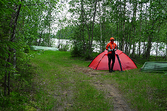 We shopped at Tore and the pressed on for the last 30 km to Kalix. About 12 km short we came across the perfect bush camp at a picnic site where we pulled off for a geocache. Right on the lake with a jetty for swimming off, and toilets, and a shelter with fireplace and all on dry ground under pine trees. Beautiful. We decided to stop here instead and pitched the tent, had a swim in the rain (freezing), and then jumped into all our clothes to stay warm and to prevent the bugs from biting. The really good thing about our new Hilleberg Staika tent is that the outer sits flush to the ground so as long as you chuck all your stuff inside and then make sure the zips are pulled all the way down, you can actually leave the inner open and make use of the vestibules bug free. This feature really adds to the available space. We had a delicious meal and a lovely night's sleep. A wonderful spot.