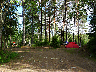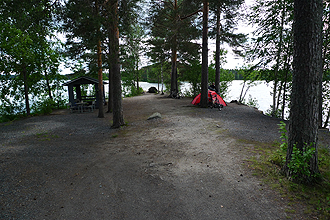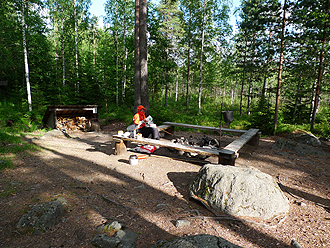 We stopped in Padasjoki to buy chocolate mousse (it had become a staple) and then had about 10 km to the Evo National Park. We weren't sure where in the park we wanted to camp so we stopped at the info board and decided on Koverno. It had drinking water, a toilet and swimming hole. We were a bit put off by a huge sign advising No Entry as this was a military area and you could only proceed with a permit. It just didn't make sense as we were on a cycle route, so we proceeded anyway and rounded the next bend to come across the actual military on some sort of activity. We just kept going and didn't make eye contact. Nobody asked any questions!!