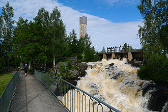 We woke with a start to discover it was 8 am. We had had such a good sleep. It is also noticeably darker at night; lightish, but definitely not broad daylight. The wind had gone and the lake surface was like glass. This had been the best paid campsite of the trip! We were on the bikes by 9:10 am and had a fabulous bike path all the way past Jämsä. Just at Jämsänkoski we passed another ski jump. I've not mentioned these but we saw our first one at Rovaniemi and then quite regularly after that. You only realise when you stand at the foot of one just how steep and high they are. Those guys are crazy!