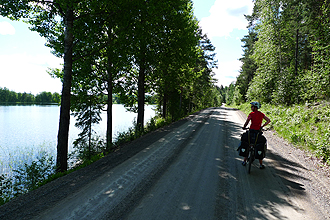Jämsä was a lively town with a large market on the go. We shopped here at the large K-City Mart. Just after Jämsä we turned onto a cycle route 24 and then we had a 25km gravel road section. This was absolutely the worst road of the trip and one of the worst we've ever cycled on. The first 7km was on a loose gravel surface and the gravel banked in places as the road was undulating with some very steep climbs. You really had to concentrate to stay upright. It was bad but still acceptable. We then hit a 4 km bitumen surface and some more dirt road but more what we were used to here - smooth as silk. The scenery was beautiful with the riding all along the lake shore. The weather was also lovely with the sun out, blue sky and big puffy white clouds. No wind.