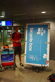 We were at the airport by 1 pm and were able to get our luggage out of storage and then spend time packing properly. We checked in and were advised that we would need to pay separately for the bikes at oversized. We checking in one bag weighing 18.5kg although we had 40kg at our disposal and then were charged EU 400 for the bikes - 200 each!! We couldn't believe it! We tried to make our case by saying that we were only charged US$100 from Perth to Stockholm for one bike as an extra item. We also tried to argue that our check-in was under 20kg IN TOTAL. The attendant was unmovable. We could understand as she was just applying the procedures that she had written down. We were shocked but had no choice and went through security checks etc. Mike then got out the Netbook and we got up the KLM website which confirmed our view and that we should only have been charged EU 100. Mike then went back to the KLM desk with this backup support and the attendant agreed with him and refunded us EU 300. Phew! Just shows how valuable it is to have access to the internet at your fingertips!